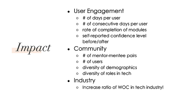 Our design helps women of color in the tech community to develop self-confidence and to grow their networks by building a strong foundation of soft skills.